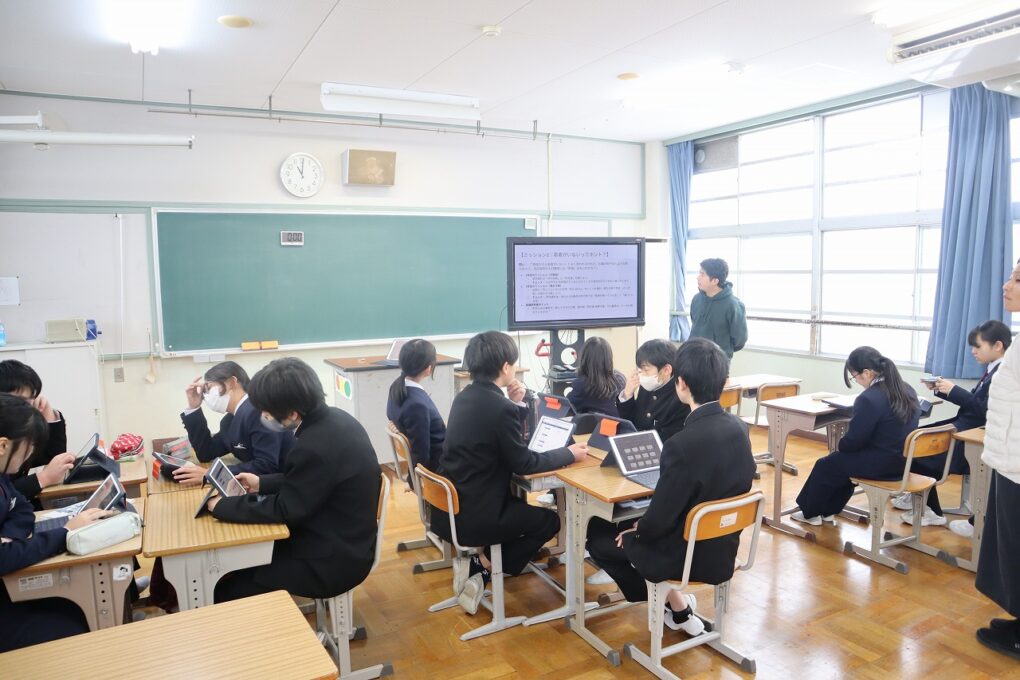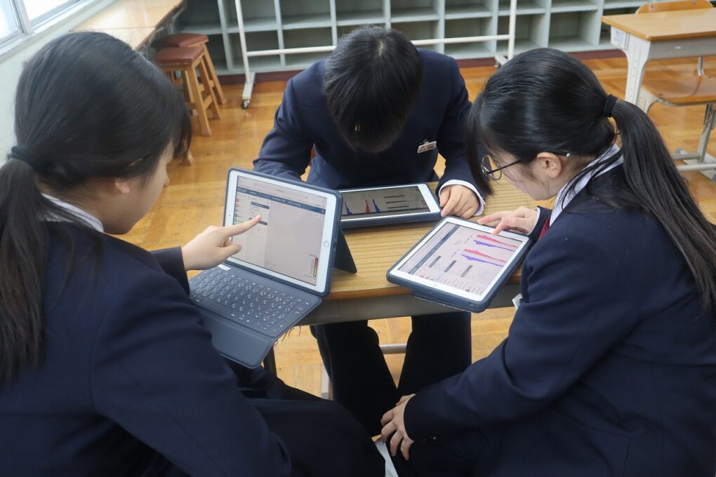 今日の1年生と2年生の数学の授業は合同で行いました。3学期は1,2年生ともにデータの活用の単元を学習します。今回は人口減少の京丹波町の現状と他の地域とのデータを調べ、チームでヒストグラムや度数分布表などを使って整理分析しました。京丹波町の人口統計のデータと生成AIの出してきた答えにずれがあったりと、苦労しながらも自分たちなりに町の課題を数値化、見える化していました。