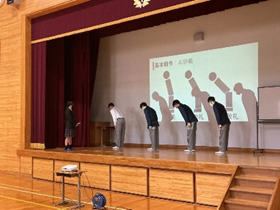 ○木津高校生に高校入試に向けてのマナーについて教えていただきました。礼の種類や角度、面接試験でのポイントも学ぶことができました。今日学んだことを、高校入試の場で活かしてください。