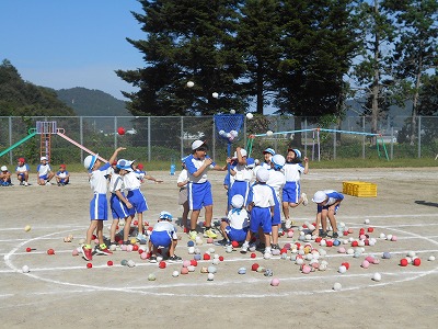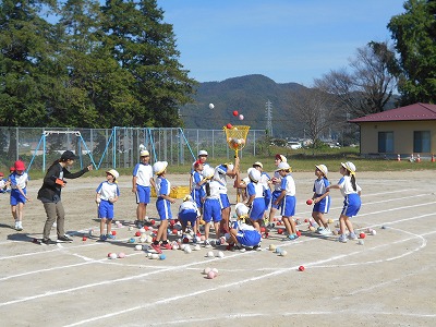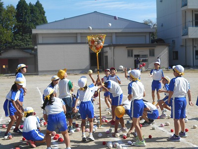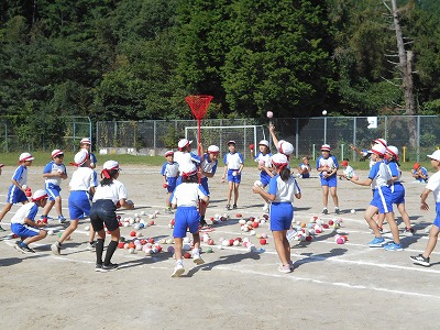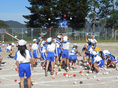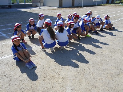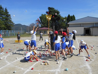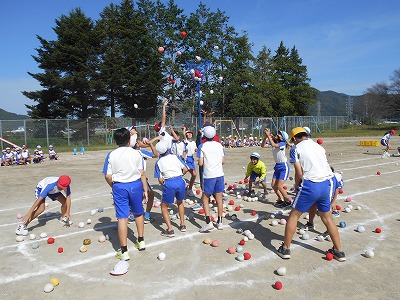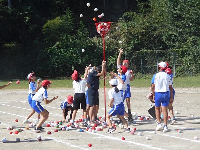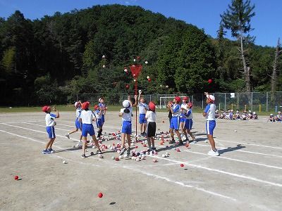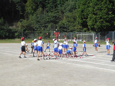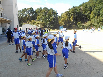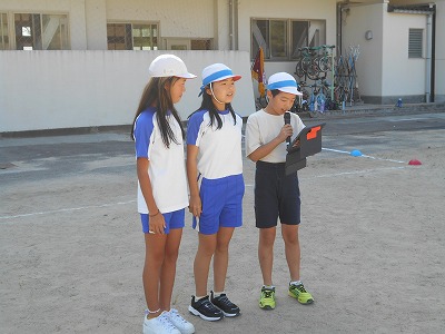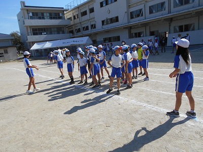 その後、児童会種目の出入りと競技のリハーサルをしました。今年度の児童会種目も低・中・高学年別の玉入れです。5年生がリーダーとなって運営する競技です。司会担当、説明担当、並ばせる担当、玉を拾って競技場に戻す担当、かごを持つ担当など、自分の役割を確かめながら実施しました。修正点も見つかり、本番に向けて5年生は調整していくことになりました。