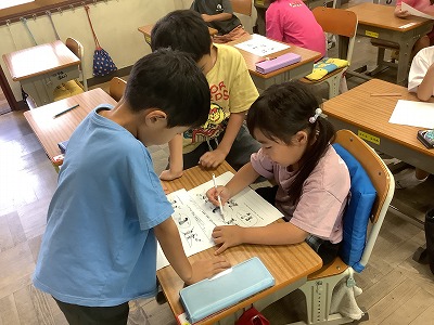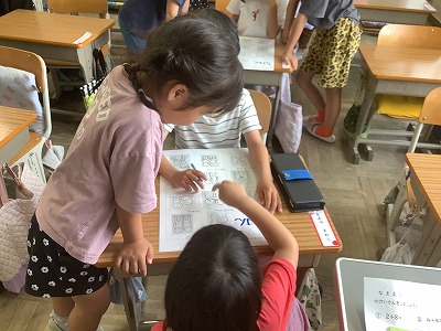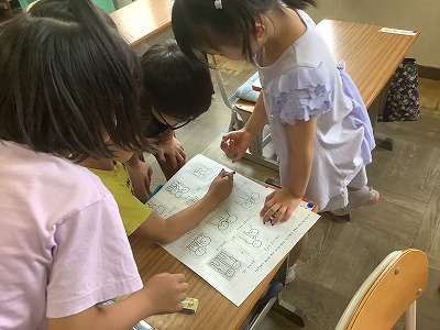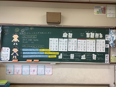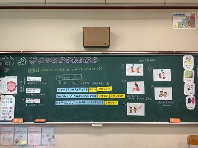 プール指導が始まっていることもあり、水着で隠れたところについて導入しました。「人には絶対見せたらあかん!」「恥ずかしいよ!」「だめだめ!」という声が返ってきたところで、お友達どうしでする「いいタッチ」と「わるいタッチ」について、子どもたちに話し合わせました。子どもによっては意見が違うこともありましたが、全体で意見を交流して、「いいタッチ」と「わるいタッチ」について考えることができました。いやな時は「やめて!」と伝える大切さを学びました。