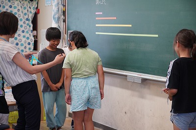 次に家族の場合や先生との場合の距離、知らない人との距離についても、実際に色分けのテープを使って考えてみました。家族はくっついたりすることもあるという結果に対して、知らない人は、「不安で怖くなる」「距離ととった方がいいと思う」などの意見が出ました。また親しい仲でも「一定の距離をとりたいな」と思う児童もいることがわかりました。