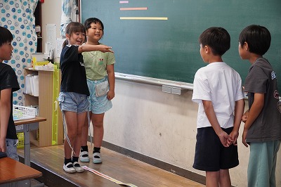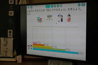 パーソナルスペース(相手との距離)は、相手との関係や状況によって違ってきます。学習は「話をするときのちょうどいい距離」について調べました。親しい友達とのパーソナルスペースは、約30㎝より近くても大丈夫な児童から、1mくらい必要という児童もいました。その理由としては「胸が苦しいような気がする」や「近すぎるとびっくりする」という意見がありました。