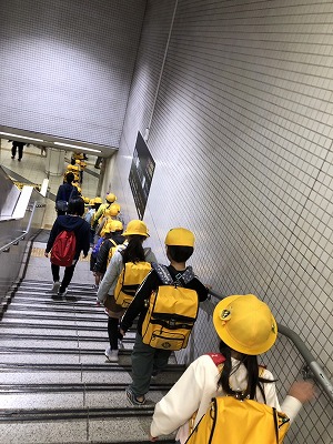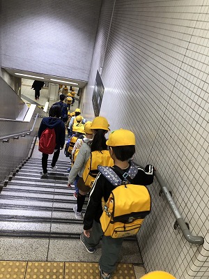 行きは、八木駅から二条駅まで電車に乗って、そこで地下鉄に乗り換えて蹴上駅まで行きます。みんなで電車に乗るのは初めての1年生。去年行ったことのある2年生がリーダーとなって、少しドキドキしている1年生に声をかけて行動できました。