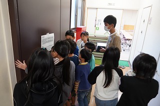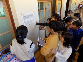 始めに全校生がニコニコ班ごとに体育館に集合し、この取組を企画した児童会本部役員が内容を伝えました。ニコニコ班で、校舎の10カ所に掲示されたクイズを、ニコニコ班全員で考えて答えていくという取組です。クイズは、1年生でも考えやすいような学校に関する内容や、低学年や中学年だけが知っているような内容など、みんなでコミュニケーションを取れるように工夫されています。クイズの前では、「1番は絶対違うけど、2番か3番やと思うな」「2番だと思う人?3番だと思う人?」など、リーダーを中心に相談する姿がありました。このように、それぞれの班は、校舎を巡りながらわいわい話し合ってクイズを考えていました。