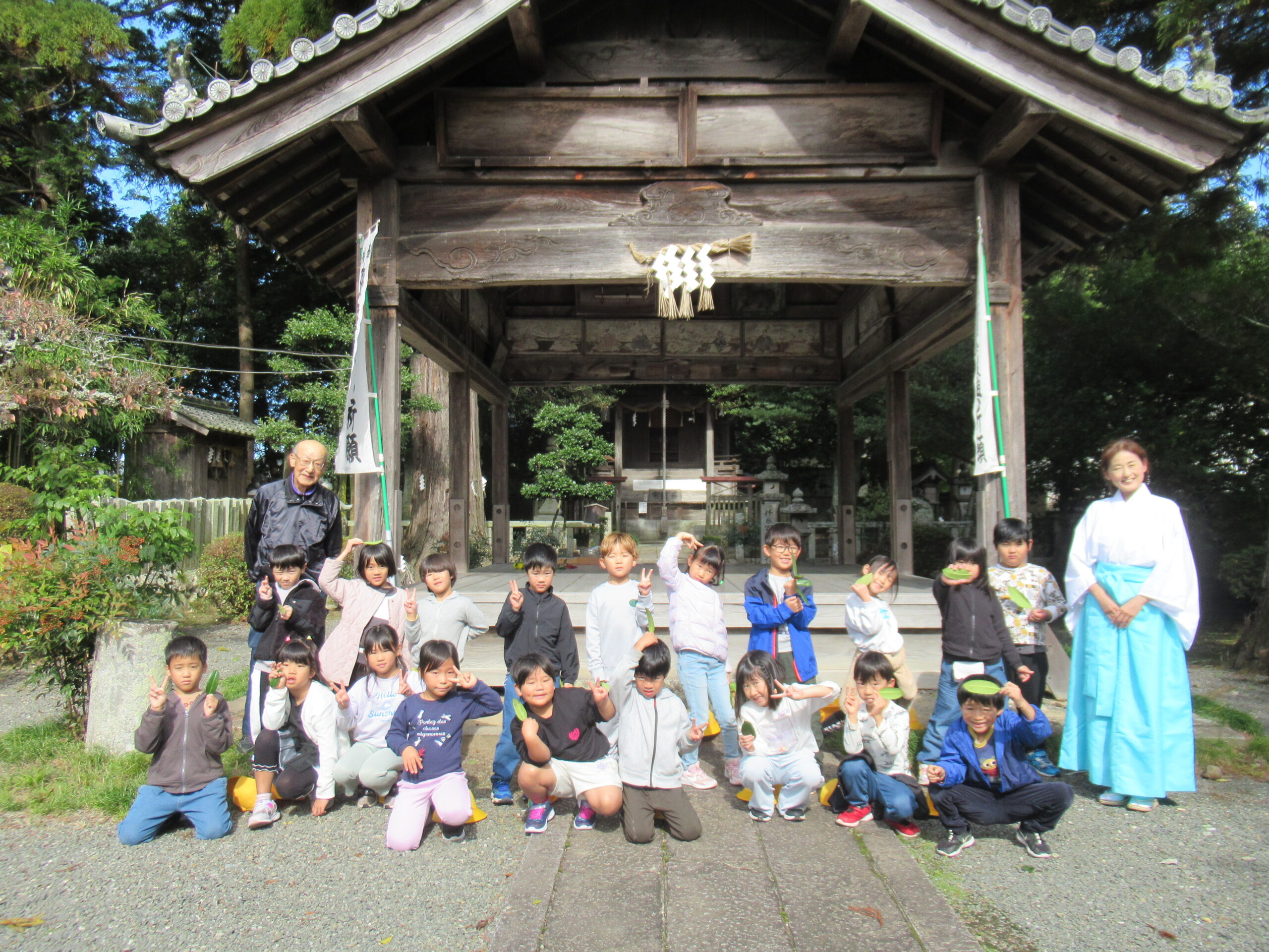 文覚ふれあい公園の次に、舩井神社でも秋見つけをしました。舩井神社では、境内にある建物に彫刻されている動物見つけも行いました。宮司さんにもお世話になり、うさぎや鳥、鹿などたくさんの動物を見つることができました。また紅葉の葉や木の実なども見つけ、たくさんの秋に触れることができました。文字を書くことができる葉も準備していただき、葉っぱに文字が浮き出てくることに感動の1年生でした!木のキーホルダーや銀杏の実、どんぐりなどのお土産もたくさんいただきました。これからの生活科の学習で活用していきたいと思います。