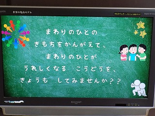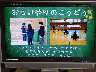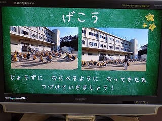 定期的に更新しながら、子どもたちの頑張りをほめたり、子どもたちへのメッセージを伝えたりするために活用しているモニター映像です。(職員室横に終日提示)