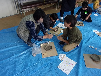 まず、作り方の説明を実演を交えて教えてくださいました。手をうまく使って平らな部分を作ったり、ふちを作ったり・・・その実演を見た子どもたちは、「すごい!」と感心していました。