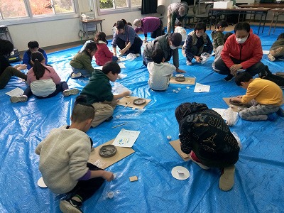 そしていよいよお皿づくりへ。自分たちで考えたデザインをもとに作ります。子どもたちは「ここはどうやったら作れるかな?」など地域の先生に聞きながら作りました。できあがると、「自分が思っていた通りにできた!」ととても喜んでいました。丁寧に教えていただいたおかげで、世界に一つの素敵なお皿ができました。焼き上がりがとても楽しみです。