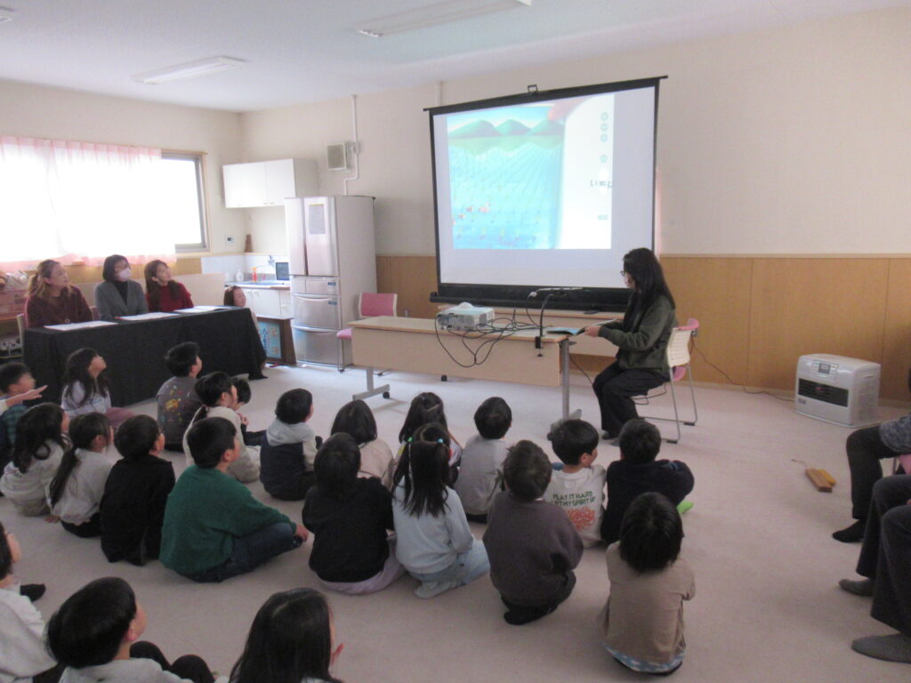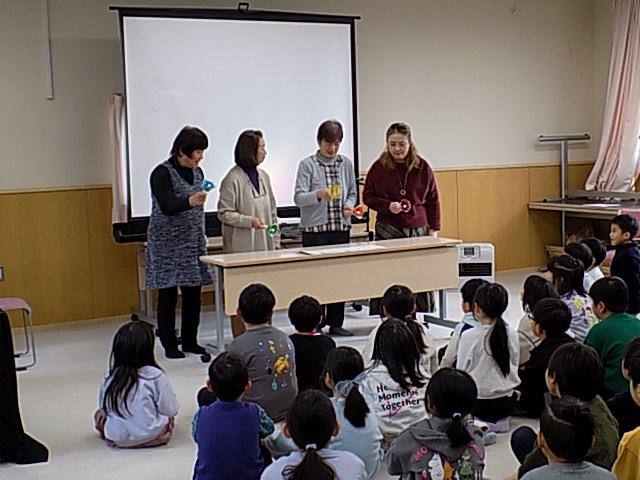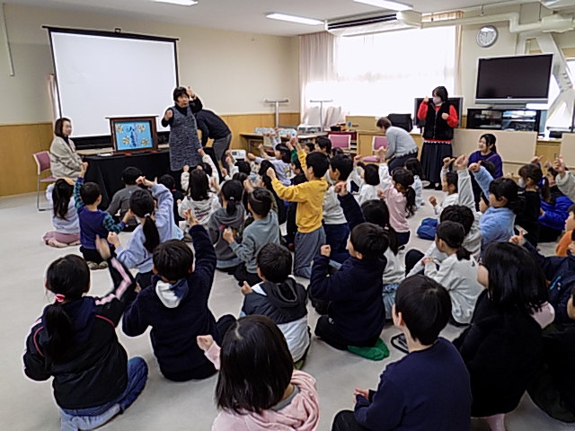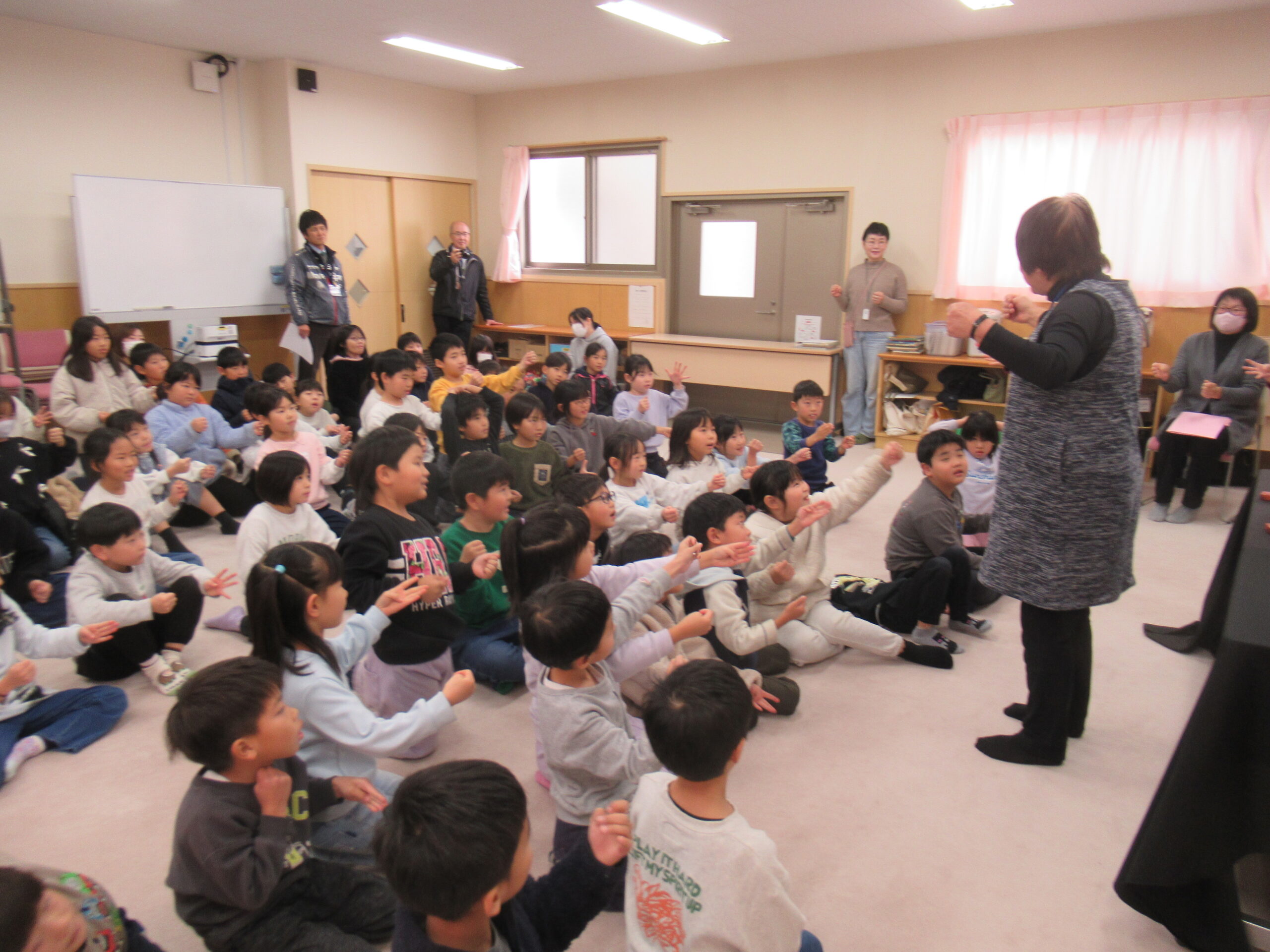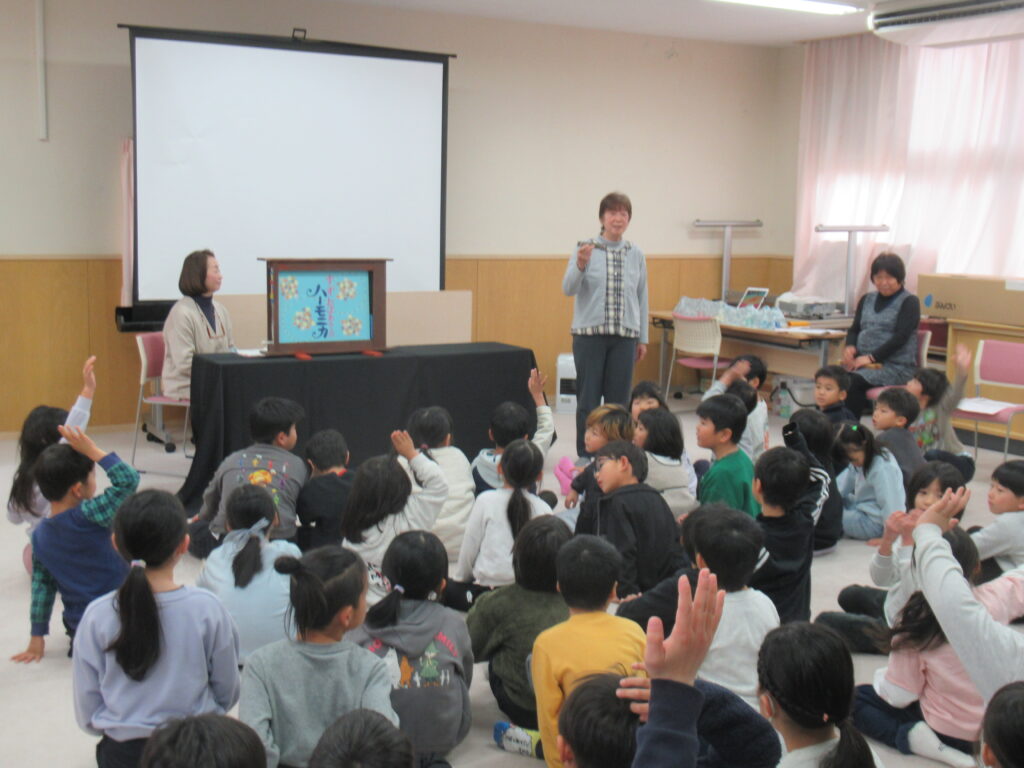 16日(火)に、読み聞かせボランティアの方々による『おはなし会』がありました。読み聞かせボランティアの皆様には、日頃から子どもたちに読み聞かせを通して、本の世界の面白さや魅力を伝えていただいています。今回のお話会では、手遊びや絵本の読み聞かせ、大型紙芝居など楽しいお話の世界を部屋いっぱいに広げていただきました!また、音のプレゼントと題して、もうすぐ来るクリスマスにちなんだ曲をハンドベルで演奏していただいたり、大型紙芝居の中でハーモニカの素敵な音色を聴かせていただいたりしました♪
