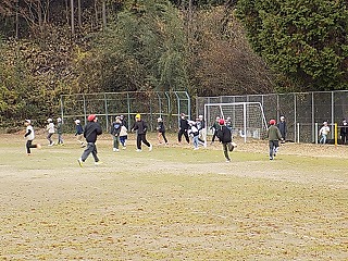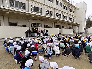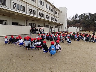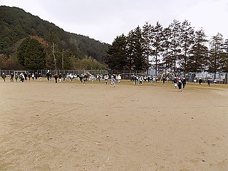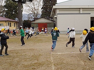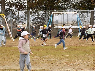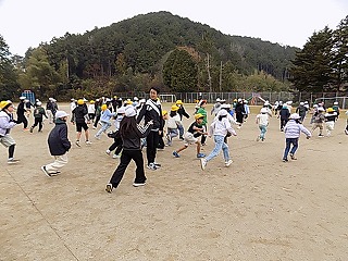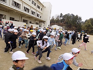「逃げてください」の言葉と同時に、全校生が一斉にグラウンドに広がっていきます。赤帽子の鬼が少ないので、始めはなかなかつかまりません。白帽子の集団が一斉に右に左に動きます。2分くらい経ったら、少し鬼(赤帽子)が増えてきます。そうかと思うとあっという間に鬼だらけになっていきます。そうなるとタッチされていない白帽子がグラウンドに目立ってくるので、赤帽子の鬼が右から左から前から後ろから、一斉に追いかけてくるので、どんなに走りが速い子どもでも時間の問題です。最後には、赤帽子ばかりになって楽しく終わるのです。写真でも初めの集合写真と終わりの集合写真は、白から赤に変わっていることがわかります。