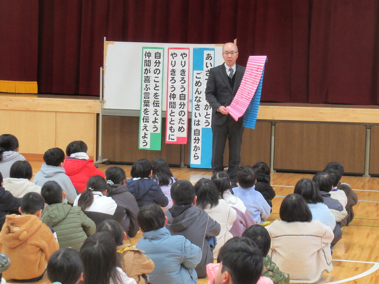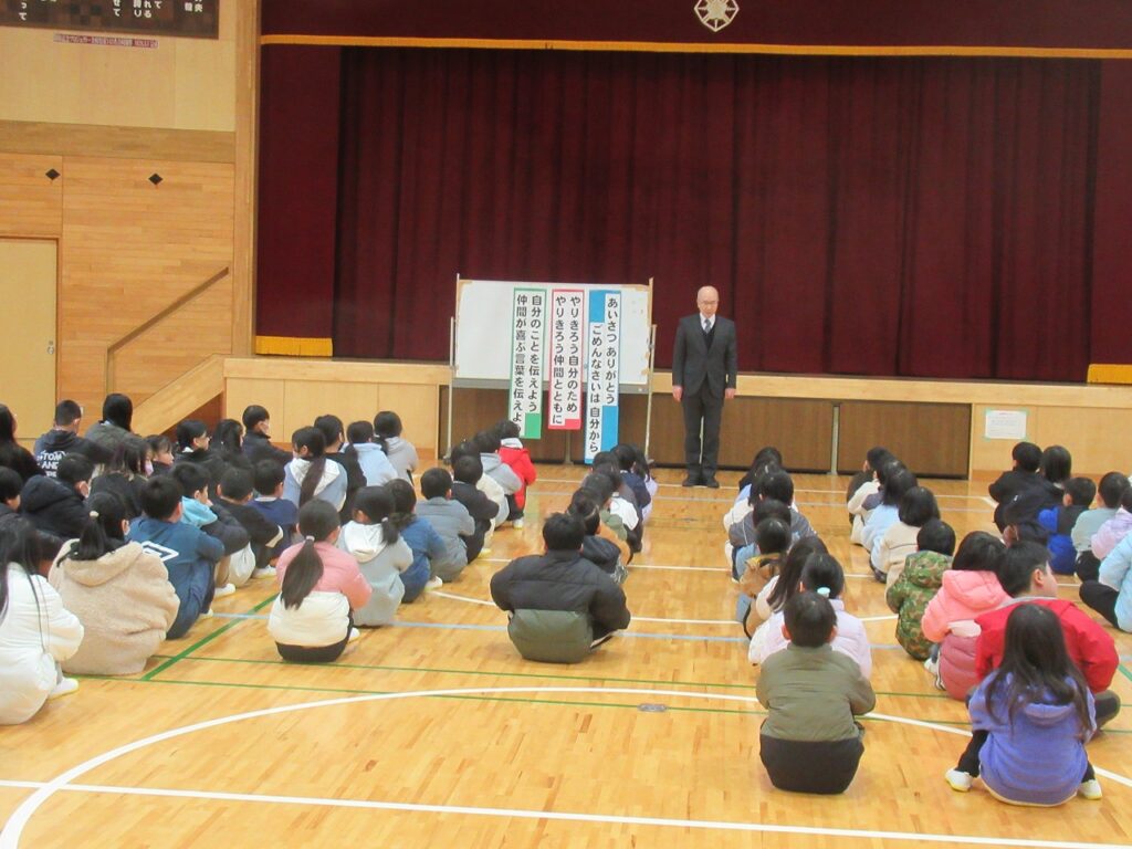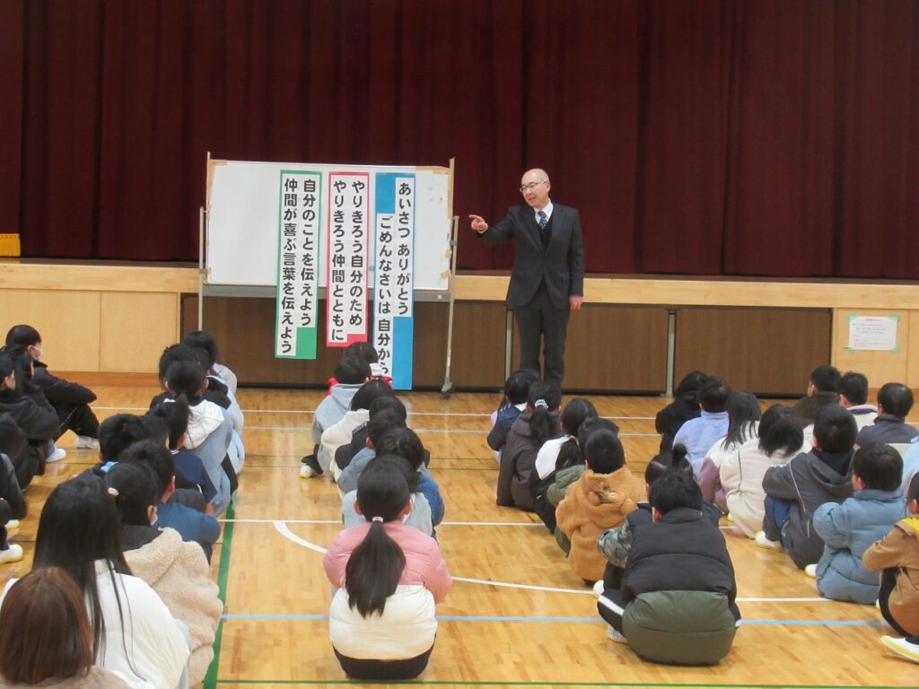 校長先生からは、人権月間で大切にした「あったかことば」や「ハッピー行動」をさらに増やしていこうということ、自分ができることは「やりきる」こと、どれだけ努力してもできないことは「助けて」と伝えること、一人ではできないことは仲間と一緒ならできることなどを大切に、3学期一緒に成長していきましょう!というお話を聞きました。
