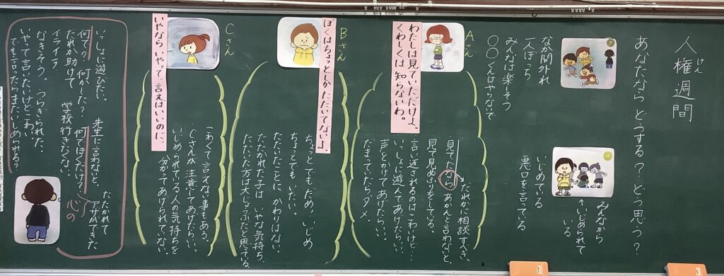 いじめている立場、見ている立場、いじめられている立場、それぞれの立場になって気持ちを考えることを通して、子どもたちは、どんな理由があっても人を傷つけることは絶対にしてはいけないこと、自分はいじめていなくても、見ているだけではいけないということを、改めて感じていました。「こわいから声をかけられないかもしれない。」と言っていた子どもたちも、「ゆう気を出して助けてあげたい。声をかけたい。」と、自分の考えに変容が見られた人権学習となりました。