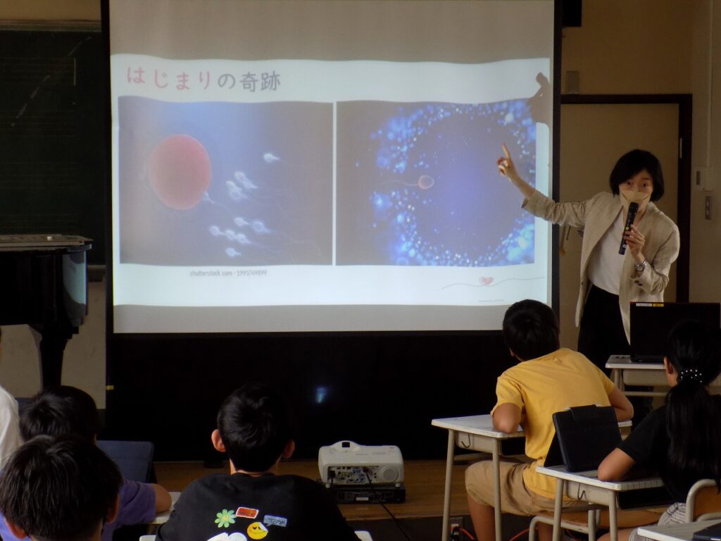 京都中部総合医療センター看護専門学校の中尾様を講師としてお招きし、助産師の仕事についてお話を聞いた後、感想や命について考えたことなどを親子で話し合いました。子ども達からは、「命の始まりが0.13㎜だと知って驚いた。」「赤ちゃんの小さな頃から、今に至っていることが本当にすごいと思った。」「命の大切さを知ることができた。命を大切にしていきたい。」といった感想が聞かれました。改めて、命の尊さや産まれてきたことへの感謝を感じる機会となりました。