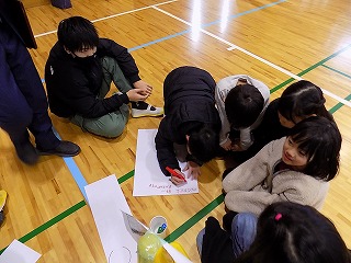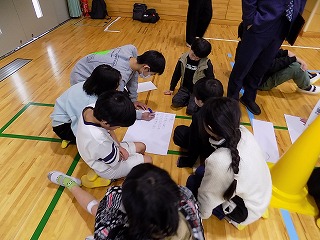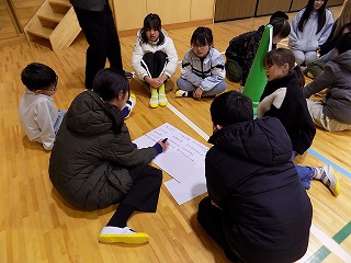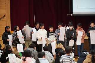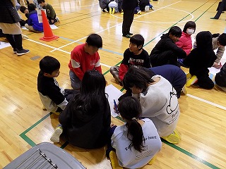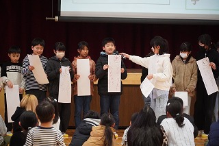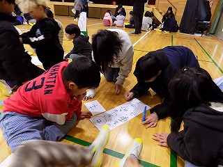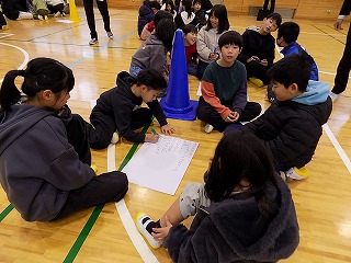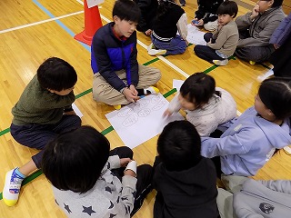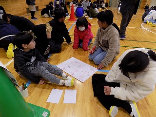 昼休み、全校児童が体育館に集まりました。児童会本部から、あいさつと目的、テーマの発表がありました。そのあと、掃除や遊びなどで顔なじみとなっているニコニコ班(異年齢班)で、八木東小学校のいいところをたくさん出し合い、1年生が選んだ頭文字のひらがなから始まる「八木東っ子のいいところ標語」をみんなで考えました。それを各班の4年生が代表で発表しました。例えば、以下のような標語です。
