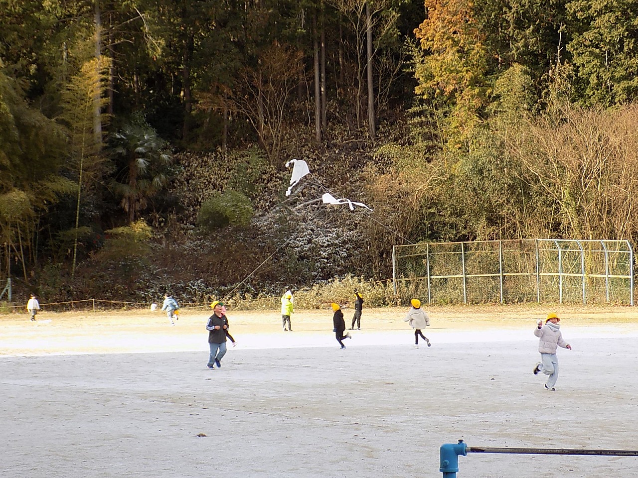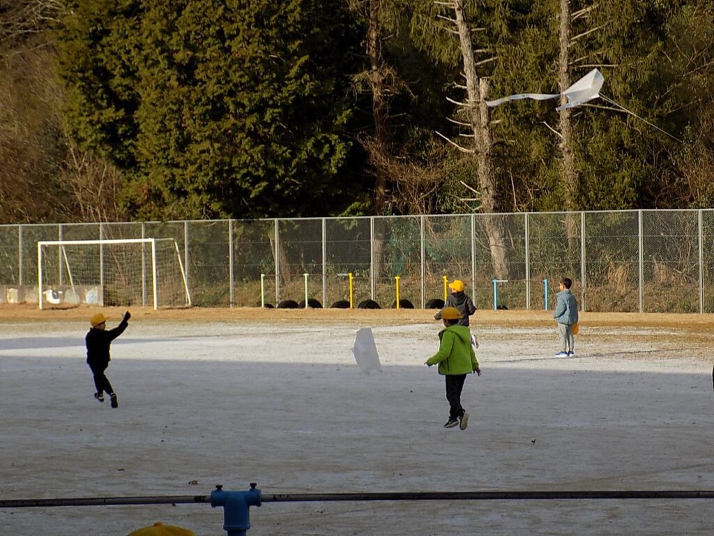 よく晴れた日。手作りの凧を持って運動場に駆け出してきたのは1年生。1年生が生活科の学習で、凧上げをしました。