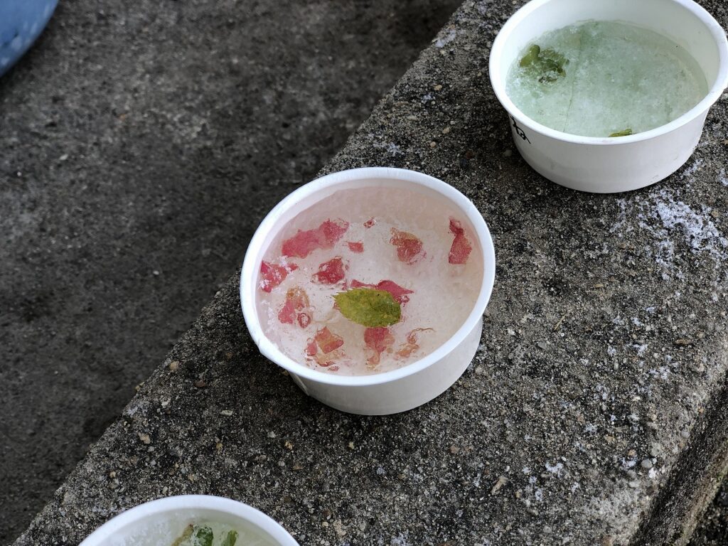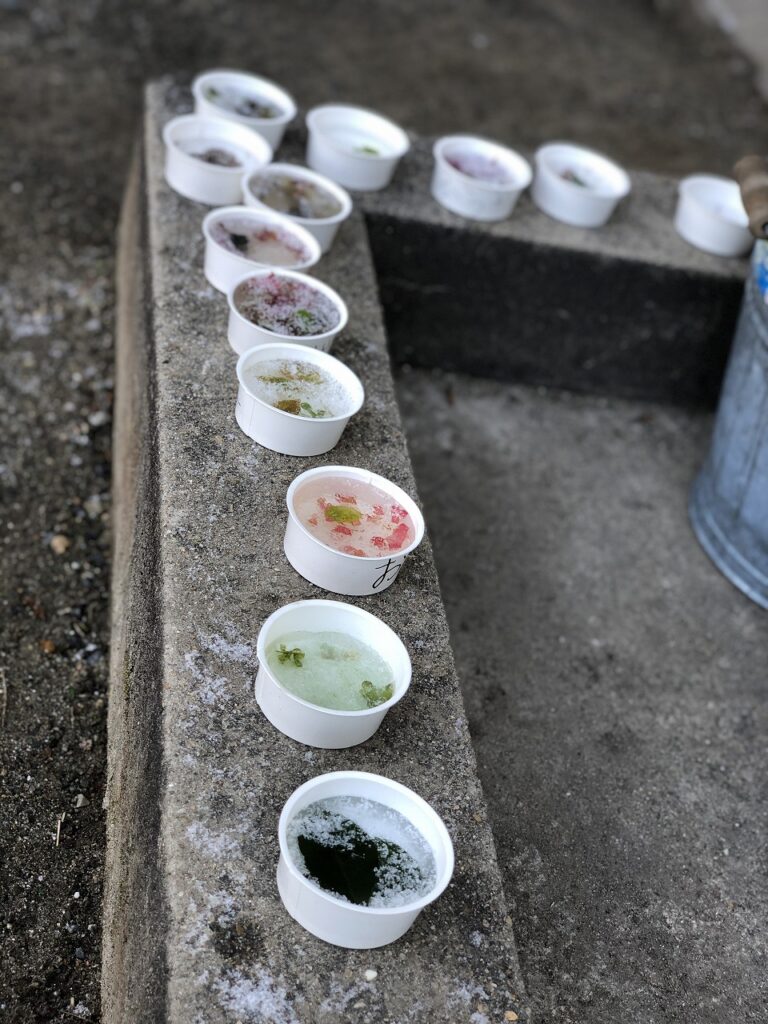 その後、手洗い場近くに置いていたカップやバケツを観察しました。実は、1年生が前日に、水や花びらなどを思い思いに入れて置いていたのです。生活科の冬の様子を学ぶ学習です。冷え込んだことによって、氷が張っていました。「つるつるー!」「きれい!」と歓声を上げていました。