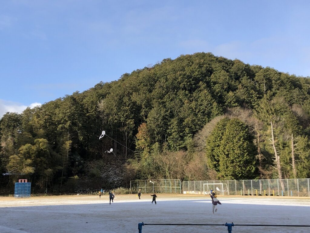 この日は風が弱かったのですが、一生懸命走る1年生の姿を喜んでくれたのか、凧は空高く舞い上がりました。子どもたちは、「わー!飛んだ!」「高い!高い!」と大喜び。元気よく駆け回る1年生とともに、澄み渡る青空に、高く、気持ちよく舞い上がる凧でした。