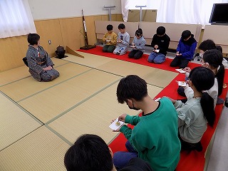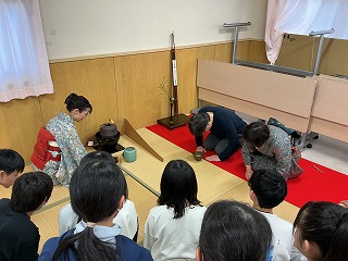2月6日(金)、講師をお招きし6年生で茶道体験教室を実施しました。まず、お茶の歴史や茶道の作法、道具の説明など、丁寧に分かりやすく教えていただきました。また「わび・さび」の意味や茶道をおこなう上で大切にされている「和・敬・清・寂」という言葉も教えていただき、茶道を通してお互いを思いやること、日常のふとしたことを美しいと思える心を大切にすることを学ぶことができました。