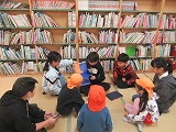 ドッジボールの後は、グループに分かれて学校案内をしました。5年生教室・理科室・図書室・音楽室・図工室の五カ所を巡り、スタンプラリーをしました。各教室では、クイズをしたり、読み聞かせをしたりするなど、その場所ならではの教室の紹介を工夫することができました。