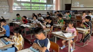 1年生 2025/10/8 【1年】鍵盤ハーモニカ 1年生が鍵盤ハーモニカの学習をしました。「ソ、ファ、ミ、レ、ド、ミ、ド」と指を動かしながら演奏しました。だんだんと上手になっていくのが分かり、1年生も嬉しそうです。 2025.10.08 1年生