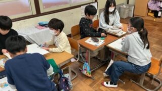 4年生は形についての学習をしました。今日は『さいころの形』についてです。さいころを作るには、○㎝の正方形が6枚必要だ!ということを確認し、一人1つのさいころを作りました。