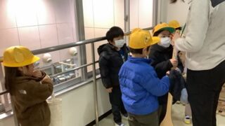 八木の給食調理場へ見学へ行きました。何百人分の給食を作る釜やしゃもじなどを見せてもらい、あまりの大きさにビックリしていました。