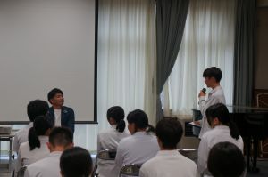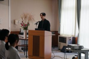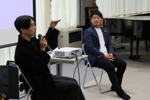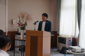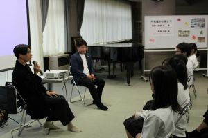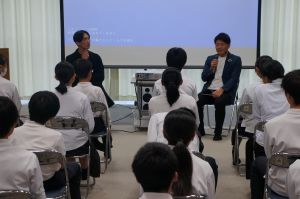 10月8日(水)午後、夜久野中学校の先輩である宮﨑元さんと居相大輝さんを講師としてお招きし、「先輩から学ぶ講演会」を行いました。会社勤務を経てスマート農業事業などの経営者として活躍する宮﨑さんと、消防士時代に経験した東日本大震災の復興活動を経て、ファッションデザイナーとして活躍する居相さん。生徒から質問を受ける形での講演会では、「苦手なことも含めていろいろなことに挑戦し、生き方の選択肢を増やす」「夜久野の何気ない風景・日常を大切に」など、たくさんのメッセージをいただき、生徒にとって生き方を考える機会となりました。
