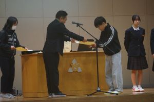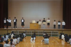11月11日(火)朝、PTA生活安全委員さんや主任児童委員さんにもお世話になり、あいさつ運動を実施しました。気持ちのよいあいさつでスタートすることができました。また、今日は全校朝礼を行いました。校長先生からは、全日本学校歯科保健優良校で夜久野中学校が奨励賞を受賞した嬉しい報告と、よりよい人間関係を築く相手への「ありがとう」の気持ちを大切に、2学期後半もがんばっていこうというお話がありました。その後伝達表彰を行い、全校で活躍を讃えました。