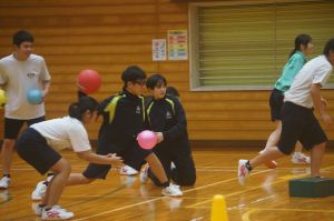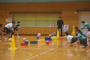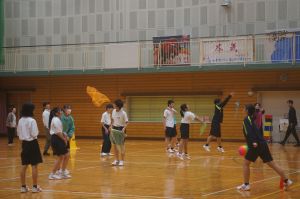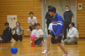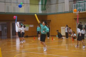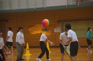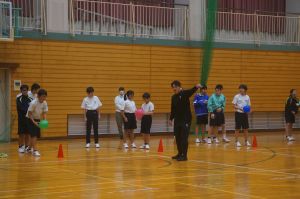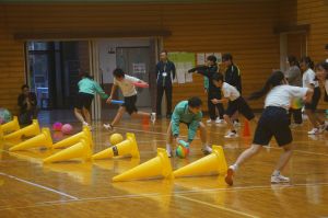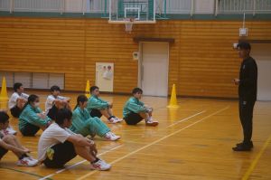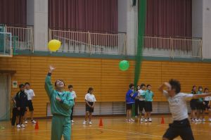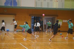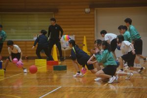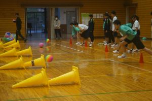 11月17日(月)部活動の時間、福知山ユナイテッドの浅尾潤一様にお世話になり、バルシューレを行いました。バルシューレとはドイツ発祥のボール運動プログラム(ドイツ語でBall schule=ボールの教室の意味)で、ボールを使った多様な運動を通じて、運動能力や判断力、チームワークを育てる活動です。中学校部活動の地域展開を見据え、基礎的な体力づくりやスポーツの楽しさを体験することを目的に、陸上部とバスケットボール部の生徒が参加しました。初めて聞く活動名に少し不安そうだった生徒たちも、一旦始まったらとても楽しそうに活動していました。どうしたら早くボールを運べるのか、どうしたら対象物に当てることができるのか、考えながら必死に競技に挑んでいました。次は1月に予定しています。今から楽しみです。
