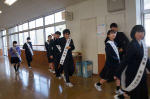 12月8日(月)より、令和8年児童生徒会選挙に向けたあいさつ運動が始まっています。登校後すぐに名前の入ったたすきをかけ、選挙管理委員の先導のもと元気よくあいさつをしながら教室を回っています。また、放送でそれぞれの公約を伝え、アピールしています。立会演説会は18日(木)です。しっかりと思いを伝え、頑張ってほしいです。
