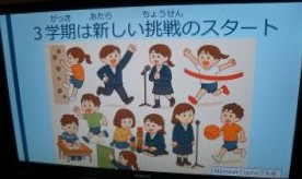 1月8日(木)、第3学期が始まりました。本年もよろしくお願いいたします。オンラインで行った始業式では、校長先生から今年の箱根駅伝での大逆転劇を例に挙げてお話がありました。挑戦した人にしか見えない景色、最後まであきらめずに頑張ったからこそ得られる達成感・結果があります。次の学年への大事な準備期間でもある3学期を、自分の力を信じて挑戦し続ける学期にしようというお話でした。続いて児童生徒会長から、新学期に向けた抱負やキャンペーンの紹介がありました。新児童生徒会の皆さんの活躍も楽しみです。