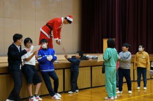1月9日(金)、令和7年児童生徒会本部役員が中心となり、全校遊びを行いました。2学期末に予定されていましたが、インフルエンザ等の予防のため延期になっていました。役員の皆さんは、サンタクロースに扮した生徒会長をはじめ、トナカイなどの衣装を身に付け、雰囲気を盛り上げてくれました。1~9年生で構成されたグループごとに協力して、校内に隠されたプレゼントボックスの中の文字を見つけます。その文字を並び替えてできる言葉を探し当てるというものでした。校内を行ったり来たりしながら、見事「ゆ・き・だ・る・ま」の正解を見つけていました。最後に生徒会長のあいさつがあり、令和7年児童生徒会の活動が終了しました。楽しい時間をありがとうございました。