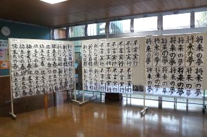 1月14日(水)~20日(火)まで、校内書き初め展を行っています。冬休みの宿題などで書いた作品を展示しています。それぞれの作品から、一生懸命に書いたがんばりが伝わってきます。保護者の皆様も、15時30分から18時00分の時間帯にお越しいただき、ぜひご覧ください。