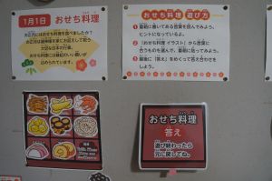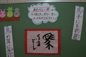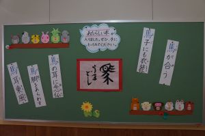 3学期が始まって一週間、校舎の中には1月らしい掲示物が飾られています。保健室前には、おせち料理や七草がゆなどの1月の食文化について、クイズ形式で学べるもの。小さな図書室前には、折り紙の十二支(とてもかわいい!)に囲まれた、味わいある書や馬の字の入ったことわざが掲示されています。養護の先生、学校司書の先生による掲示物から、新しい年の雰囲気が感じられ、思わず立ち止まって見てしまいます。