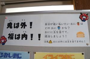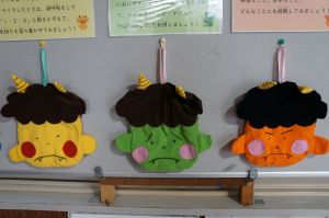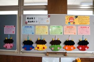 立春の前日である今日2月3日(火)は「節分」です。保健室前には「イライラおに」「よふかしおに」「なまけおに」など、こどもたちにとって悪い鬼が並んでいます。怖いけど、養護の先生手作りの、温かみのあるかわいい鬼です。自分が退治したい鬼に玉を当てる仕組み(玉は鬼に引っ付きます)になっており、子どもたちも玉を投げてやっつけています。悪いものを追い出し、縁起のよいものを食べて、新しい季節を迎えるための行事である「節分」を楽しむのもいいものです。