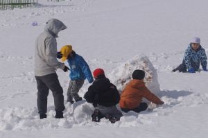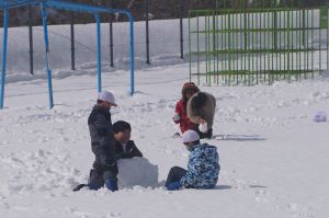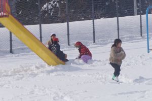 グラウンドでは、2年生が雪遊びを楽しんでいました。子どもは風の子、元気いっぱいです!