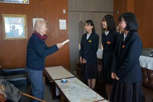 学園日記2月17日(火)、福知山ユネスコ協会の芦田様にご来校いただき、児童生徒会本部役員の3名が書き損じはがきを受け渡しました。児童生徒会が回収キャンペーンを行い、集まった107枚のはがきをお渡しすることができました。はがきは換金され、すべての人が公平に教育の機会を得られるように、無償で学ぶ機会を応援する「世界寺子屋運動」の活動に使われます。