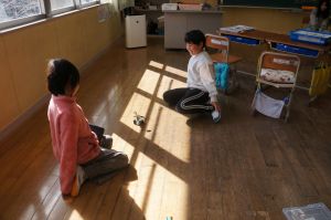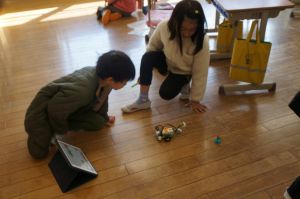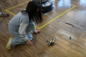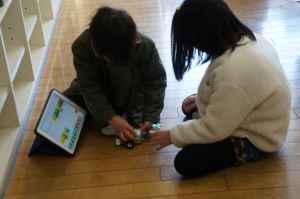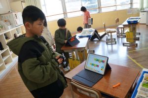 福知山市では、小学校3年生から6年生がプログラミングについて学習します。今日は、3年生でプログラミングの授業が行われていました。レゴで作ったロボットを、プログラミングで操作し、動かします。今日は、障害物を感知して停止したり、音や光を出すようにプログラムし、実際に動かしていました。意図したとおりにロボットが反応すると、「やった!止まった!」「光った!」など、嬉しそうに喜んでいました。逆に、思うようにならない時には、どうしたらいいのか改善点を考え、試行錯誤する姿がありました。学習を通して、子どもたちが情報化社会で主体的に生きるために必要な、論理的に考え、物事を分析し、効率的な解決策を見つけ出す力を養います。