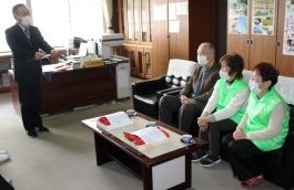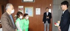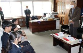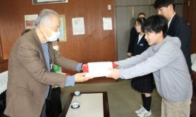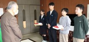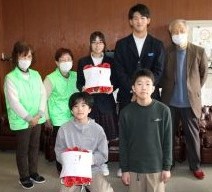 福知山市老人クラブ連合会 夜久野支部 の皆様が、3月2日(月)の2校時終了後に、卒業生が卒業証書授与式で身につけるコサージュを校長室まで届けに来てくださいました。今年度、9年生は、3月13日(金)、6年生は3月19日(木)に卒業の日を迎えます。支部長からは、「ますます変化が激しく先が分からない時代となっていくが、未来を創る担い手としてこれからの時代をたくましく切り拓いていってほしい」というお話があり、コサージュとともにはなむけの言葉も贈っていただきました。6年生・9年生の卒業生を代表してそれぞれ2名が贈り物を受け取り、お礼の言葉を申しあげました。式当日は、いただいた真紅の花を胸に飾り、式場となる夜久野学園体育館の中央を堂々と晴れやかな姿で歩み出していくことを期待しています。卒業生たちは、今、小学校・中学校の卒業という節目を迎え、これまで支えていただいた様々な多くの方々の思いを、改めて身にしみて感じる日々を送っています。