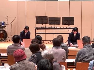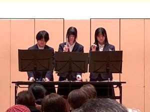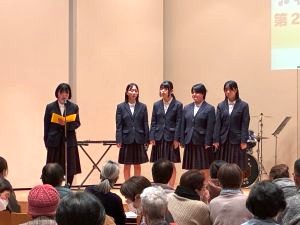 学園日記3月7日(土)、夜久野ふれあいプラザで行われた「名曲喫茶」に、音楽部が参加しました。今年も、MAF管弦楽団の皆さんと共演させていただきました。第1部のMAFの演奏に続き、第2部では音楽部の生徒が、筝、トーンチャイム、リコーダーを演奏しました。初めて挑戦する楽器もありましたが、練習の成果を発揮して一生懸命に演奏する姿に、客席の皆さんから温かい拍手が送られました。第3部は合同で「残酷な天使のテーゼ」や「少年時代」などを演奏し、迫力のある音色を聴かせてくれました。
