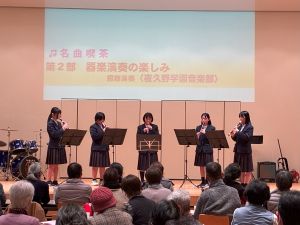3月7日(土)、夜久野ふれあいプラザで行われた「名曲喫茶」に、音楽部が参加しました。今年も、MAF管弦楽団の皆さんと共演させていただきました。第1部のMAFの演奏に続き、第2部では音楽部の生徒が、筝、トーンチャイム、リコーダーを演奏しました。初めて挑戦する楽器もありましたが、練習の成果を発揮して一生懸命に演奏する姿に、客席の皆さんから温かい拍手が送られました。第3部は合同で「残酷な天使のテーゼ」や「少年時代」などを演奏し、迫力のある音色を聴かせてくれました。