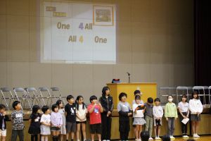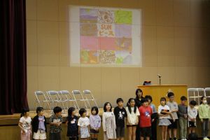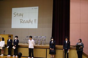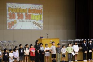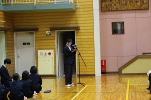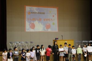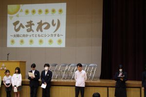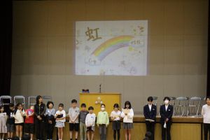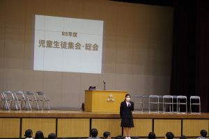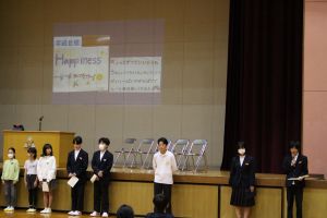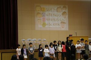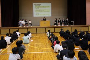 4月28日(火)3校時、全校で児童生徒集会を行いました。各学級の代表者が、そこに込められた思いを説明しながら、各学級の目標を堂々と発表しました。