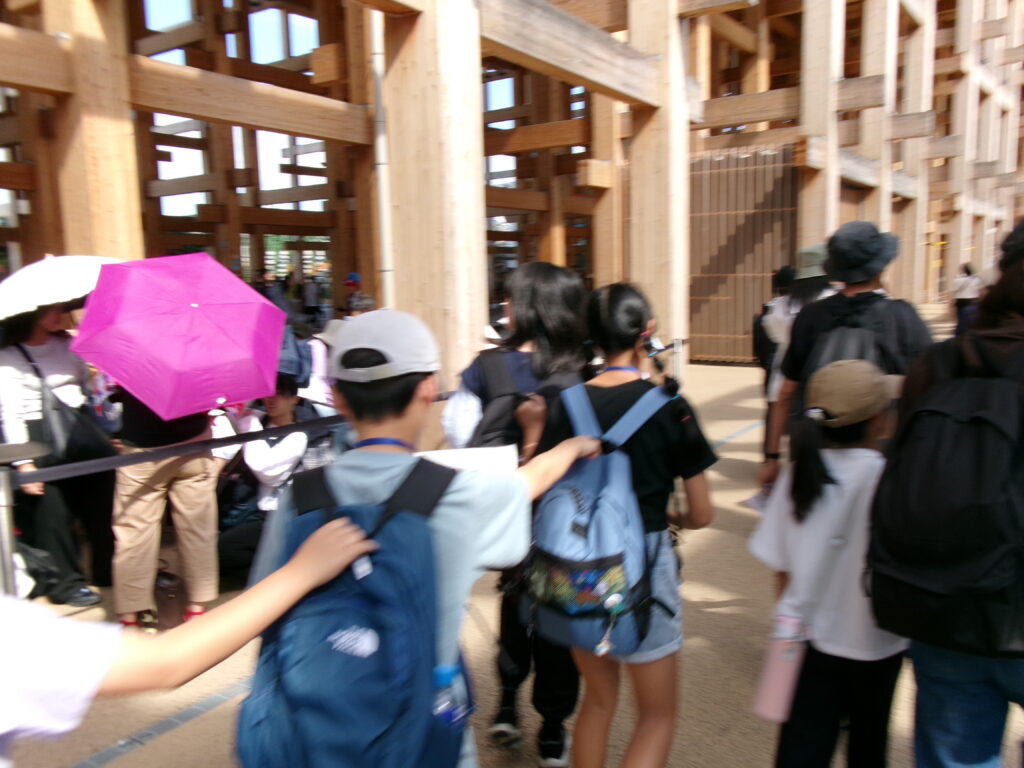 やまだっ子の様子 高学年が大阪・関西万博へ行きました。閉幕目前の日だったので、たくさんの来場者がおられました。その中をグループで相談しながらパビリオン巡りをしました。スタンプを集めるグループ、大屋根リングを1周するグループ、疲れた人たちは座って見られるブースでお笑いのライブを見学するなど、時間いっぱい楽しみながら学ぶことができました。長時間の移動の最中は、バスでのレクレーションをしたり、DVDを鑑賞したり、楽しくおやつを食べたりしながら過ごすことができました。