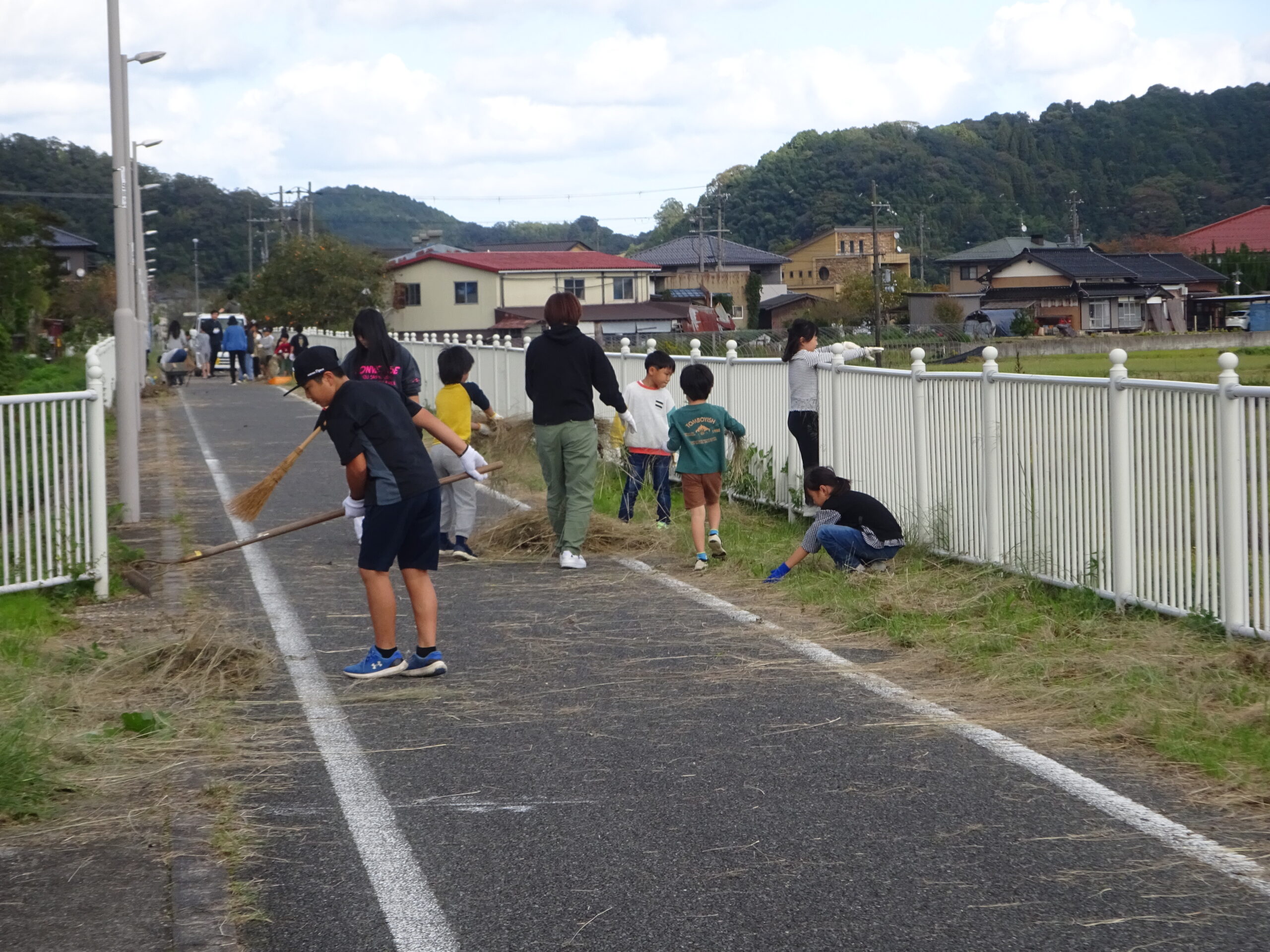 やまだっ子の様子 「自分にチャレンジ!レース」に向けて、大会5日前にコースのクリーン作戦を実施ました。サイクリングロードを石などを掃く人やわきの草を取る人など、チームに分かれて異年齢で役割分担をして行い、1時間で気持ちの良いコースになりました。