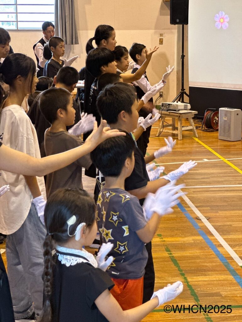 ホワイトハンドコーラスNIPPON京都チームの皆さんの自信にあふれたパフォーマンスを見せてもらい、子どもたちは大きなエネルギーをいただきました。そして、一緒にパフォーマンスをすることを通して、ともに楽しく過ごすことの心地よさを感じることができました。アンコールの「アエミバナナ」ではバナナ役を京都チームの方と6年生児童が一緒に行い、会場が笑顔と拍手の渦に巻き込まれました。見えなくなるまで手を振る子どもたちの姿を見て、このひとときが1人1人の心に大きな灯となったことを感じました。