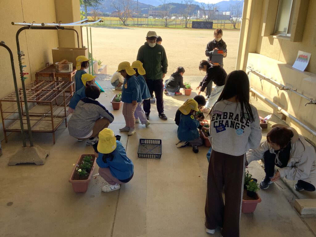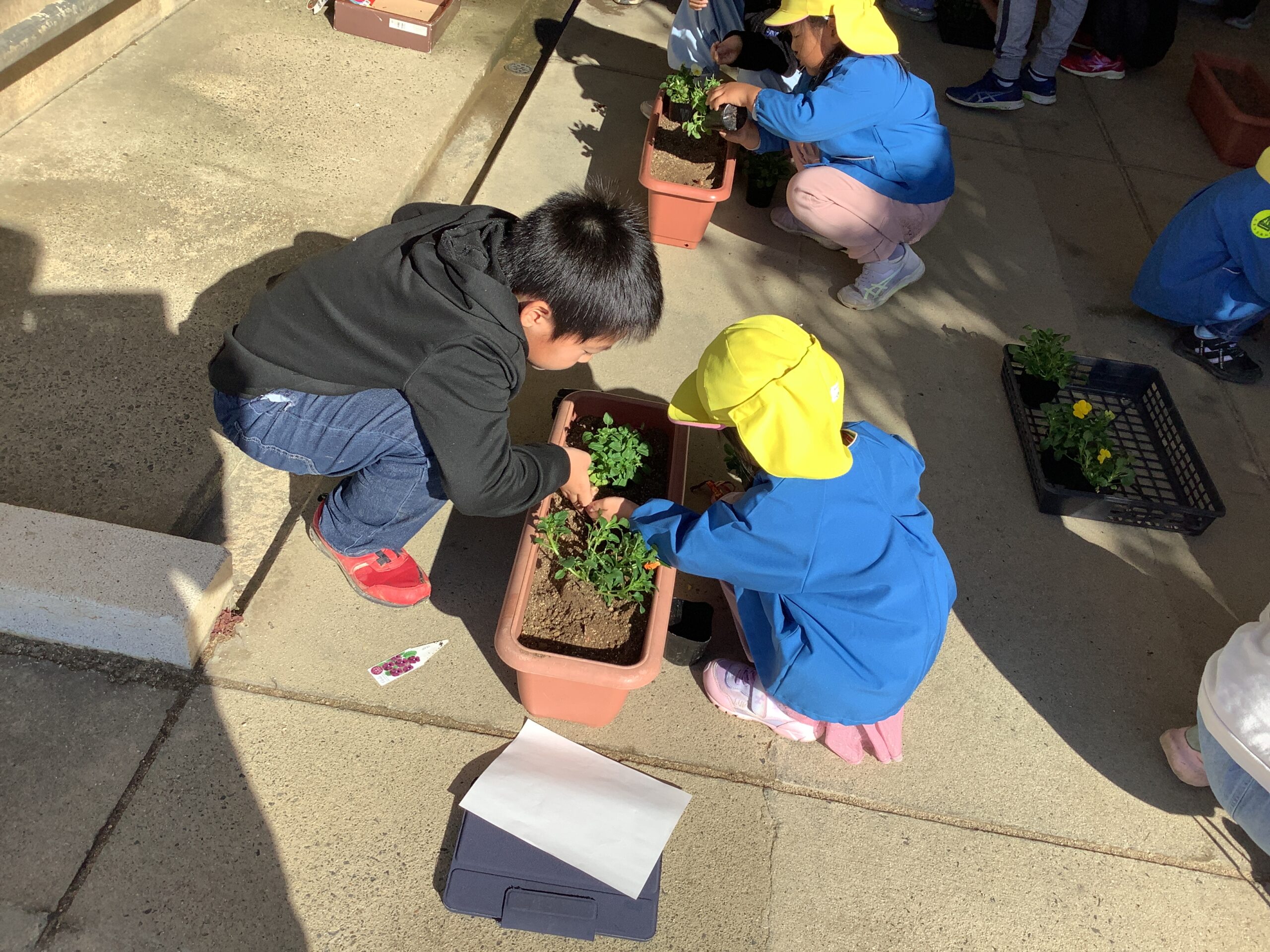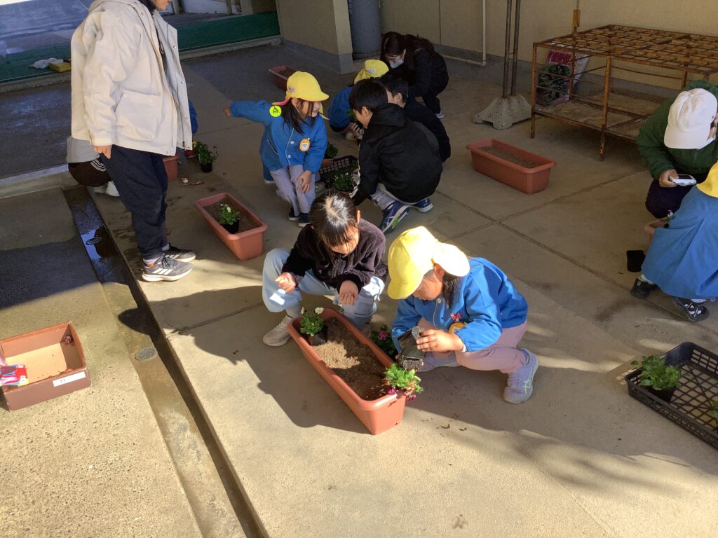 そして最後に、4月入学してきた時に咲くように、年長児さんと4年生が仲良くチューリップの球根とビオラをプランターに一緒に植えました。4月まで4年生がお世話をしていきます。花が咲くときには年長児さんは1年生です。