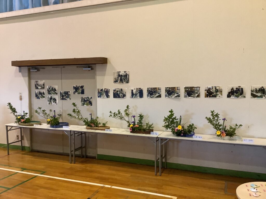 学校運営協議会の事業として昨年度に引き続き、華道芸術学院准教授 嵯峨御流 村島 智州様の指導の下、4年生児童の生け花教室の花も展示しました。