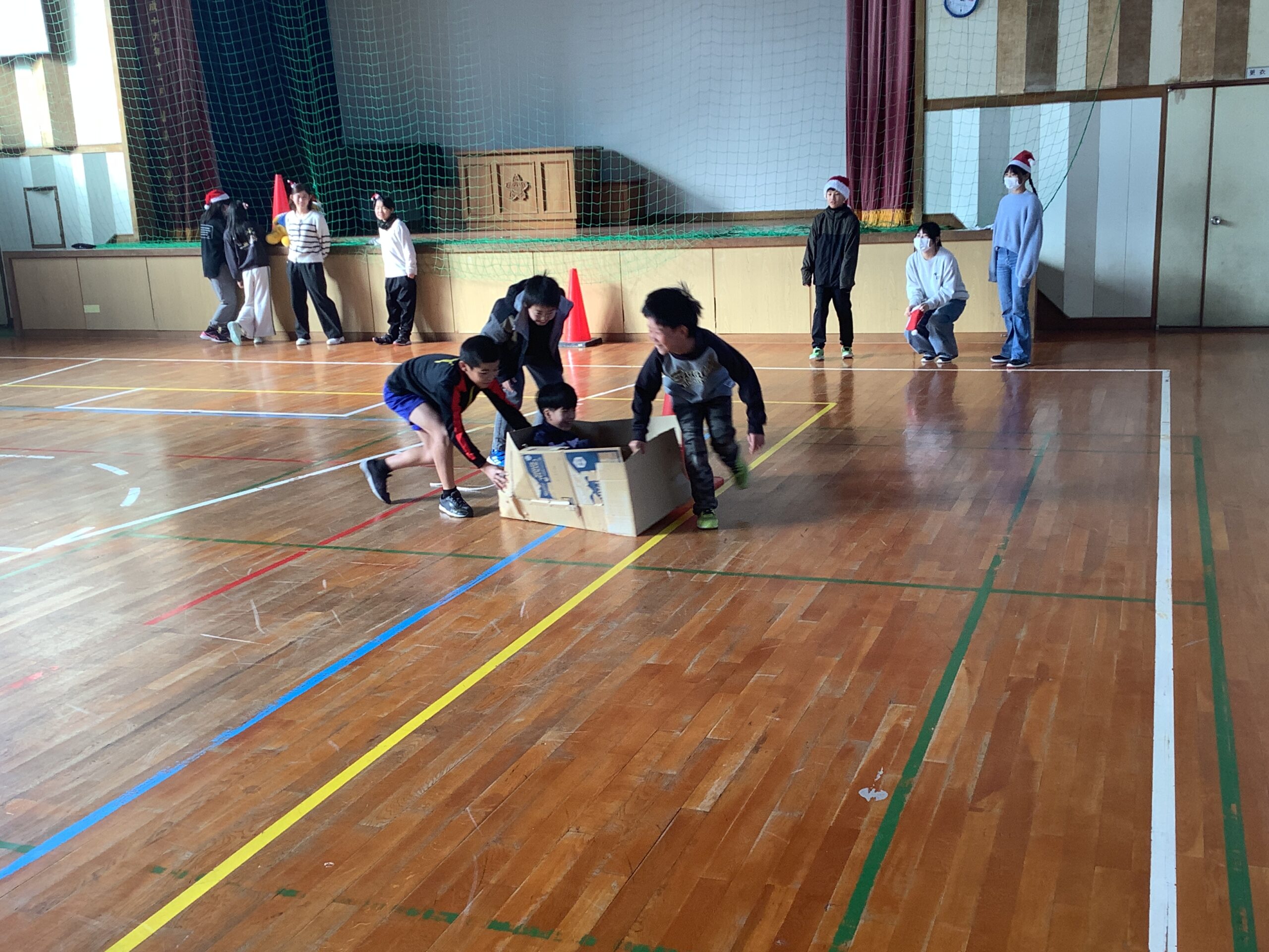 クリスマスにちなんで「プレゼント運び競走」という全校遊び委員会の企画遊びがありました。