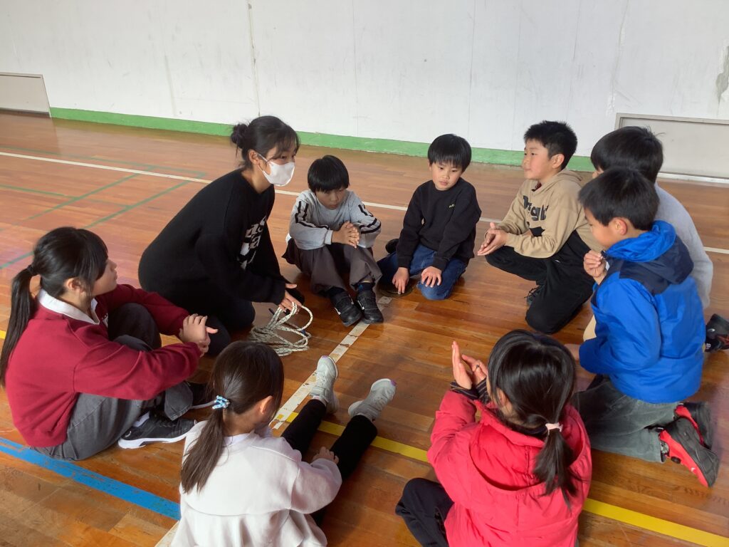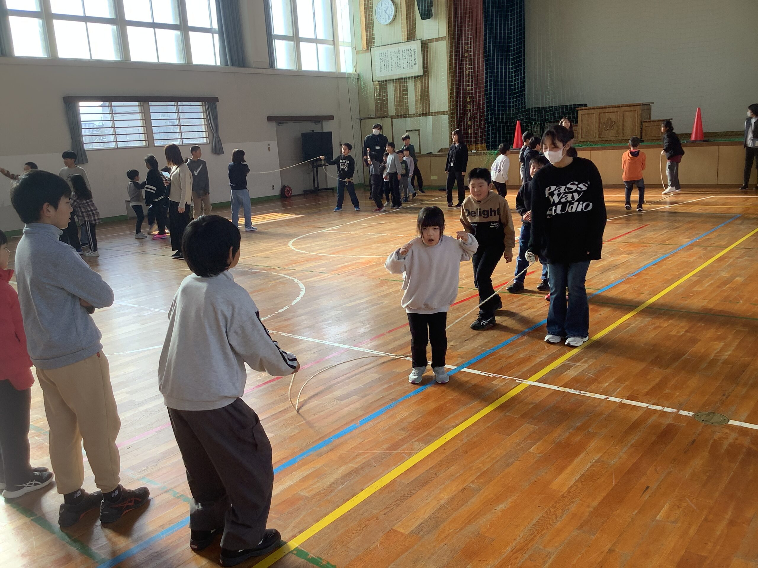 1月30日に実施される「Enjoy!心と心のつながりジャンプ」の練習が始まりました。赤・青・黄色の異年齢チームを2つに分けて、目標回数に向けて八の字跳びをします。なかなかうまく跳べない1年生に2~6年生の子どもたちが優しく教えています。跳べなくても「おしい」「ナイスチャレンジ」などの声掛けも素敵です。本番に向けて心と心をつなげてジャンプします。