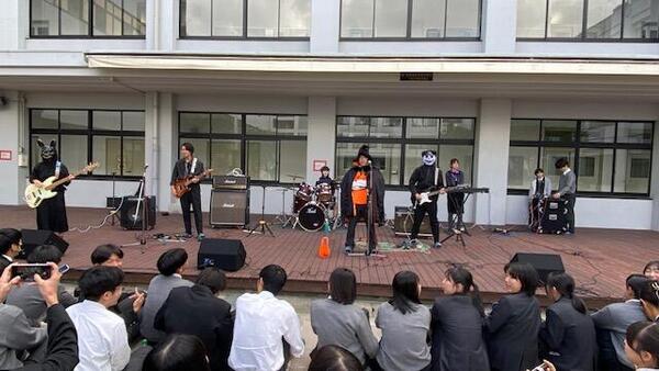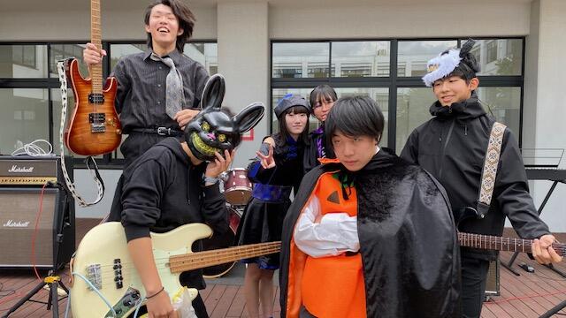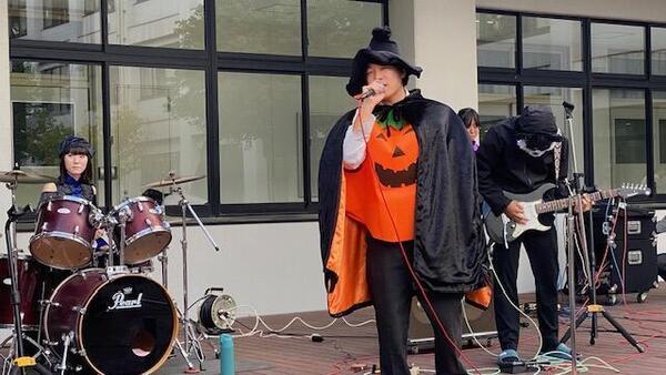 10/28(Tue)の昼休みに、恒例のHalloween Eventを行いました。2年生実力派バンドFermataが「ヤングアダルト」「飛行艇」の2曲を演奏しました。肌寒い午後でしたが、たくさんの生徒たちが中庭に集まり、校舎の窓からもたくさんの観客に応援してもらいました。ステージからメンバーが"Treat"のキャンディーを投げると、みんな楽しそうに受け取っていました。